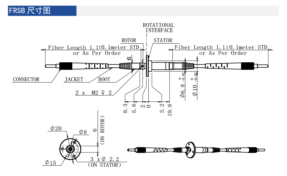 FRSB是一款易安裝單通道光纖滑環,安裝直徑為10mm(與光纖連接器保持一致),定子端為螺釘安裝,設計有3個安裝孔,轉子端有撥叉銷和扳手位兩種帶轉方式,方便用戶安裝使用。FRSD可以選擇單模或多模光纖,具有良好的光學性能,并且防水防塵。